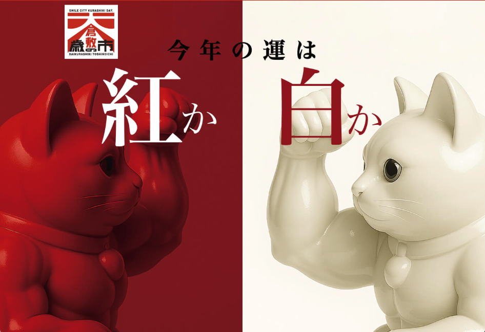 岡山県倉敷市の伝統的な年末市「大倉敷歳の市2025」のメインビジュアルを制作。日本の縁起物文化を象徴する招き猫をモチーフに、紅白の色彩対比と3DCGによる質感表現で、伝統と革新が交差するビジュアルコミュニケーションを構築しました。「今年の運は紅か、白か」というコピーラインとともに、招き猫の持つ福を招く象徴性を、現代的なデジタルアートの文脈で再解釈。